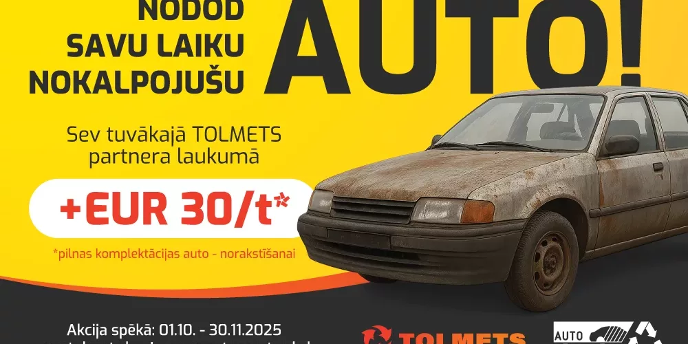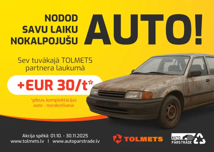 No 1. oktobra līdz 30. novembrim 2025 ikviens, kurš nodos pilnas komplektācijas nolietotu automašīnu ar automašīnas norakstīšanu- saņems papildu bonusu +30 EUR/t pie aktuālās 12AM cenas!